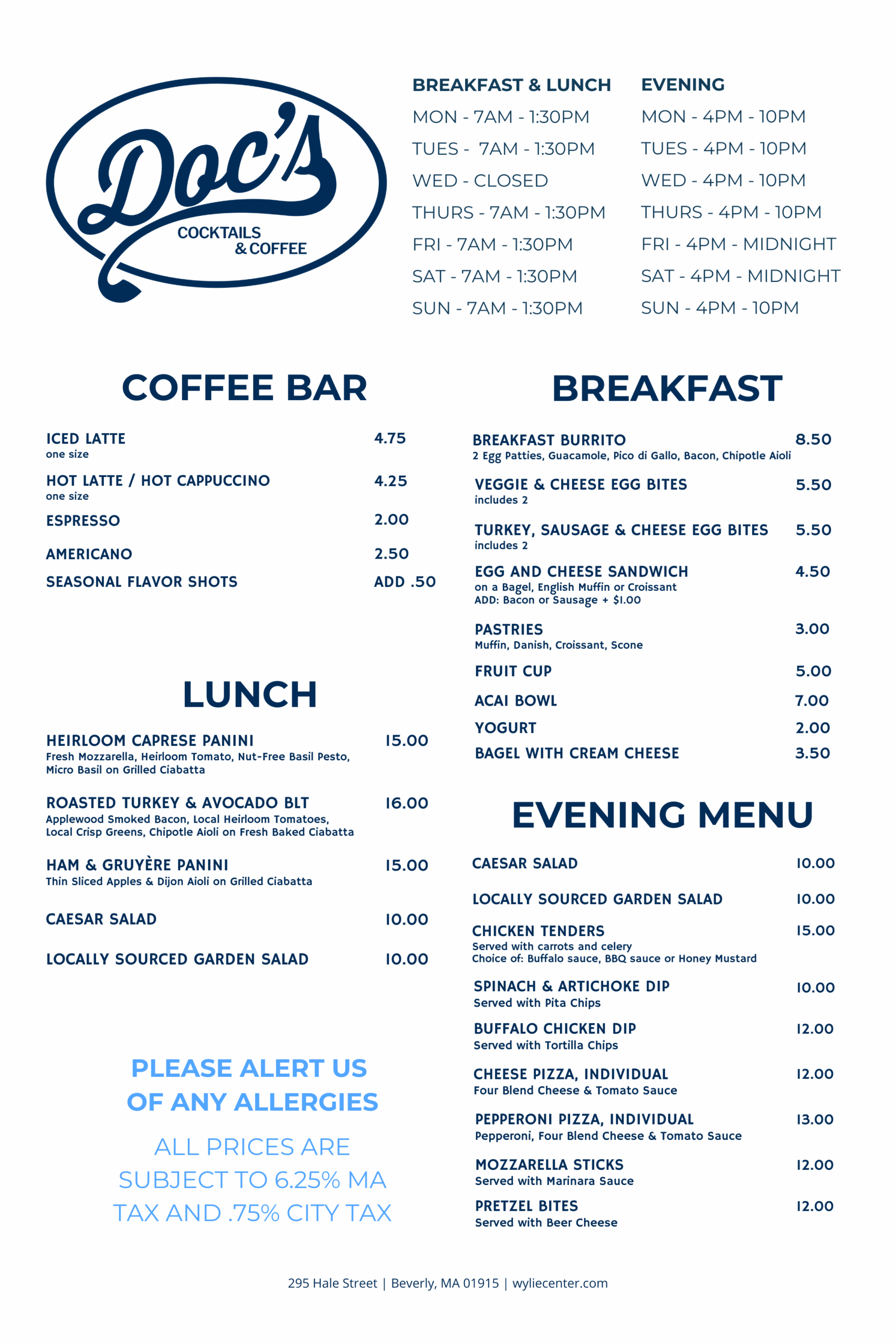 Welcome to Doc’s Bar, the lively social hub of The Wylie Center. Serving breakfast, lunch, dinner, and handcrafted drinks, it’s the ideal spot to fuel your day or unwind after a full schedule. Just steps from your guest room, Doc’s Bar offers a warm, welcoming space to relax, reconnect, and celebrate the North Shore spirit, any time of day.